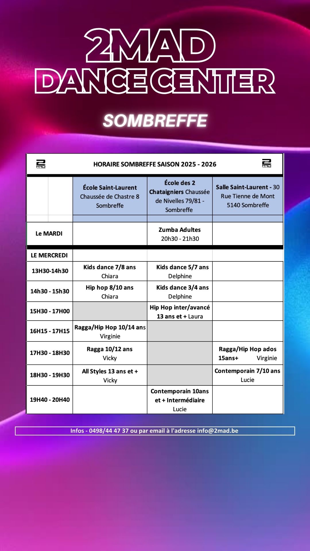 L'horaire 2025- 2026 est disponible !!! Essais gratuits le mercredi 3 septembre !!! Zumba le mardi 16/09 ==> Cliquez ici